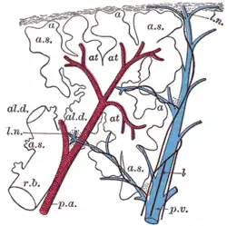 ![]() شکل شماتیک لوبول اولیه ریه؛ r. b برونشیول تنفسی؛ al. d آلوئولار داکت؛ at شریان؛ a. s آلوئولار ساک؛ 'a' آلوئول؛ p. a. : شریان ریوی؛ p. v ورید ریوی؛ l لنف؛ l. n غده لنفاوی. | |