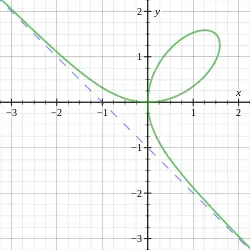 فولیوم دکارت (سبز) با مجانب (آبی) وقتی a = ۱.