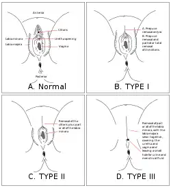 سازمان بهداشت جهانی (WHO) در سال ۱۹۹۷ میلادی مُثلهکردن آلت تناسلی زنان را بر سه نوع تقسیمبندی کرده بود که در شکل نمایش داده شدهاست.[24] گزارش جدیدتر سازمان ملل چهار گونهٔ این عمل را برمیشمارد:[1]