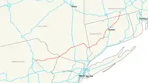 | US 209 in Matamoras, PA NY 17 in میدل تاون، نیویورک I-87 / Thruway in نیوبورگ، نیویورک US 9 in Fishkill, NY I-684 / US 6 / US 202 / NY 22 near Brewster, NY US 6 / US 7 / US 202 in دانبری، کنتیکت Route 8 in واتربری، کنتیکت I‑691 in Southington, CT I‑91 / US 44 in هارتفورد، کنتیکت US 20 in استوربریج، ماساچوست | |