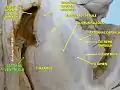![]() Drawing of a cast of the ventricular cavities, viewed from the side; oriented facing right. | |