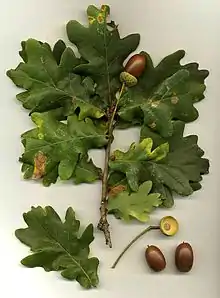 | شاخهای از بلوط قرمز اروپایی به همراه میوه و برگ. | |