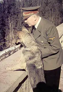 ![]() اوا براون و آدولف هیتلر، with Hitler holding Blondi on a leash. | |