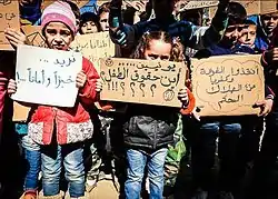 کودکان این دو شهرک پلاکارهایی با نوشته های "ما نان و امنیت می خواهیم"، "یونیسف، حقوق کودکان کجاست؟"، "فوعه و کفریا را از هلاک قطعی نجات دهید" و ... در دست دارند.