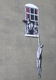 - در جون ۲۰۰۶، بنکسی مرد برهنهای را کشید که از پنجرهای آویزان شده بود. تصویر از خیابان پارک در مرکز بریستول قابل رویت بود. این گرافیتی موجب برپا شدن مناقشهای با شورای شهر بریستول شد و تصمیم برای باقیماندن یا پاک کردن آن به نظر سنجی گذاشته شد.[88] تصویر باقیماند و بعدتر توسط دیگر هنرمندان گرافیتی با رنگ آبی پوشانده شد.[89]
