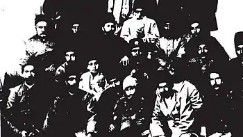 ردیف دوم از راست به چپ: یکی از خویشاوندان بهاءالدوله، جهانسوز میرزا، میرداماد (با سرداری ترمه)، محمد مصدق (جوان با لباس سفید)
