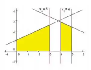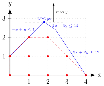نقاط صحیحی که میتوانند جواب مسئله باشند در شکل با رنگ قرمز نشان داده شدهاند و خطوط بریده بریده قرمز نشانگر ناحیه امکانپذیر برای جواب مسئله است. خطوط آبی، ناحیه ای را نشان میدهد که پاسخ مسئله بدون در نظر گرفتن شرط صحیح بودن در آن قرار میگیرد.