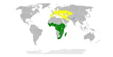 | نقشهٔ پراکندگی بوتیمار کوچک زرد: تولید مثل سبز: سکونت دایم آبی: بدون تولید مثل | |