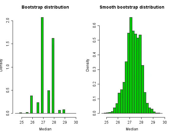برای هموار کردن گسستگی میانه، ما میتوانیم مقدار کمی از N(۰، σ۲) نویز تصادفی را در هر نمونه بوت استرپ وارد کنیم. برای نمونهای با اندازهٔ n انتخاب میکنیم . هیستوگرامهای توزیع بوت استرپ و توزیع هموار شدهٔ بوت استرپ در زیر مشخصاند. توزیع بوت استرپ بسیار دندانه دار است زیرا میانه تنها مقادیر کمی را میتواند بپذیرد. اما توزیع بوت اترپ نرم شده بر این مشکل غلبه میکند.