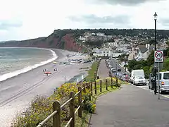 ![]() The seafront looking west towards اکسموث. The red cliffs are around 250 million years old. | |