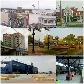 ![]() Clockwise from top: Downtown Buriram featuring the Sang Rung Interpark Hotel, Buriram Old Town Hall, Romburi Park, Buriram Railway Station، ورزشگاه نیو آی-موبایل و Buriram General Hospital. | |