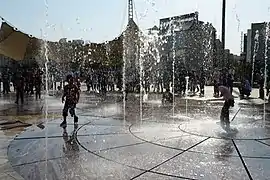 فواره های آبِ پارک آب و آتش در محیطی دایره مانند، آب را از ۲۴۰ نقطه مختلف تا ارتفاع ۱۰ متر به شکلی آهنگین به سمت آسمان پرتاب می کنند. ستون های آب در درون زمین قرار گرفته و به طرزی طراحی شده اند که افراد به راحتی می توانند از روی آنها حرکت کرده و به مسیرشان ادامه دهند.