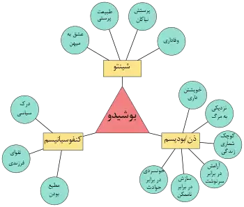بوشیدو تلفیقی از اصول و مبانی سه دین شینتویسم، بودیسم/ذن و کنفوسیانیسم است.[7]