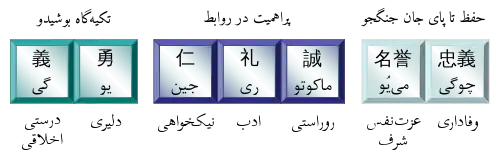 دستورالعملهای بوشیدو توسط نیتوبه اینازو در کتاب بوشیدو: روح ژاپن در دوره میجی (چاپ ۱۹۰۰ میلادی) با هفت فضیلت مشخص میشود:[15]