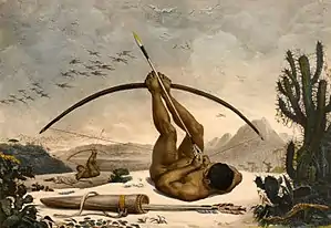 نقاشی، سه بومی برزیلی را در حین تیراندازی با کمان و در حال شکار نشان میدهد.