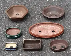 ته گلدان بونسای سوراخهایی برای زهکشی وجود دارد که با مش ریز پوشانده شده است. به این ترتیب خاک در گلدان باقی میماند و هیچ گونه آفتی نمیتواند از کف عبور کند. گلدان معمولاً دارای پایه است، به طوری که تهویه زیر گلدان امکانپذیر است. کنارهها ترجیحاً مستقیم یا به بیرون مورب هستند. به این ترتیب پرورشدهنده وقتی میخواهد روی ریشه کار کند، میتواند بونسای را به راحتی بیرون بیاورد.