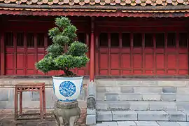 وقتی بونسای آماده شد، آن را در یک گلدان تزئینی قرار میدهند که معمولاً از ظروف سفالی ساخته شده است. گلدان به عنوان یک قاب برای بونسای عمل میکند، دقیقاً مانند یک قاب برای یک نقاشی. اندازه گلدان با بونسای تنظیم میشود. معمولاً حداکثر مقطع طولی مربوط به دو سوم ارتفاع گیاه است. ارتفاع گلدان تقریباً با قطر پایه تنه برابر است.