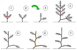 سیم را به شاخهها میپیچند، به طوری که آنها میتوانند به شکل صحیح چوبی شوند. زمان لازم برای این امر به نوع گیاه بستگی دارد. این مدت برای اکثر درختان برگریز شش تا نه ماه است اما برای درختان سوزنی برگ ممکن است چندین سال به طول انجامد.