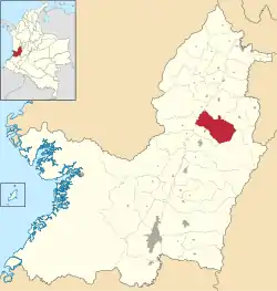 ![]() Location of the municipality and town of Bugalagrande in the Valle del Cauca Department of Colombia. | |