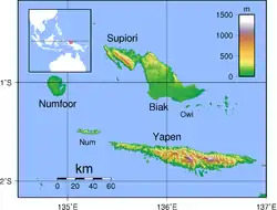 بیاک در خلیج سندراواسی در نزدیکی ساحل شمالی پاپوآ، از استانهای اندونزی، واقع شدهاست، در شمال غربی گینه نو. بیاک بزرگترین جزیره در مجمعالجزایر کوچک خود است که دربرگیرنده شمار زیادی آبسنگ، آبسنگ حلقوی و صخره مرجانی است. این جزیره از نظر اداری به ۱۲ بخش تقسیم شده است.