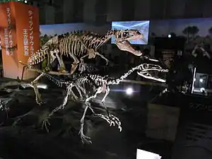 | اسکلت یک گوانلانگ در کنار اسکلت یک آلیوراموس | |