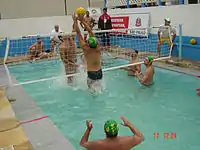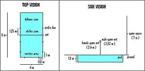 این ورزش در استخری به طول ۸ متر، عرضی به طول ۴ متر و عمقی به طول ۱/۳۰ متر برگزار میشود. در وسط آن توری مخصوص نصب میشود. این تور بازی برای مردان در ارتفاع ۲/۶۲ متر و برای زنان در ارتفاع ۲/۴ متر نصب میشود.[2]