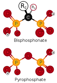 Basic structure of a bisphosphonate on top. To compare the structure of pyrophosphate below. Note the similarity in structure.