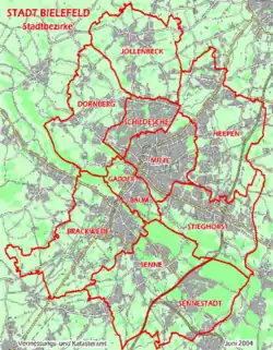 City-districts of Bielefeld: Bielefeld-Mitte (downtown), Brackwede, Dornberg, Gadderbaum, Heepen, Jöllenbeck, Schildesche, Senne, Sennestadt and Stieghorst ![]() | |