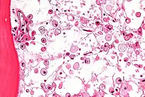 | عکاسی ریزنگاری of Gaucher disease, with cells that have the characteristic crumpled tissue paper-like سیتوپلاسم. H&E stain. | |