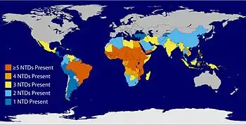 | نقشه همپوشانی جهانی شش مورد از بیماریهای گرمسیری مغفول رایج در سال ۲۰۱۱. | |