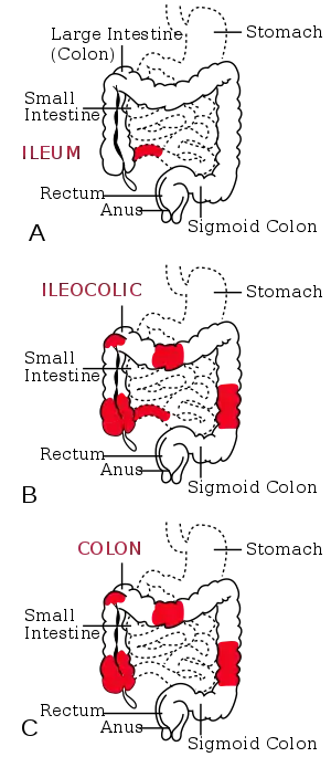 | سه سایت عمده از روده که دچار کرون میگردد. | |