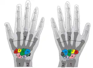 | Shown is the right hand, palm down (left) and palm up (right). Proximal: A=Scaphoid, B=Lunate, C=Triquetral, D=Pisiform Distal: E=Trapezium, F=Trapezoid, G=Capitate, H=Hamate | |