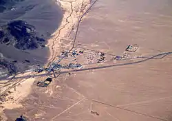 ![]() Aerial view of Baker looking north: I-15 jogs south around the town, leaving Baker Boulevard, the main street, to show where the pre-interstate highway (US 91 و US 466) went. فرودگاه بیکر sits just north of the city alongside northbound CA 127، the "Death Valley Road". | |