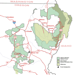 ![]() Baker City along I-84 in Oregon, surrounded by sections of Wallowa–Whitman National Forest. | |