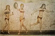 باستانشناس انگلیسی جیمز ملارت در توصیف جامهٔ الهه مادر در چتلهویوک (از آثار دورهٔ مسسنگی در ترکیهٔ امروزی، مربوط به حدود ۵۶۰۰ (پ.م) ) آن را به بیکینی تشبیه میکند. در این تندیس الهه مادر بر روی دو پلنگ نشستهاست و جامهای شبیه بیکینی بر تن دارد.[1][19] پیشینهٔ لباس شنای دوتکه را ولی باید در جهان یونانی رومی پی گرفت. بر روی کوزهها و نقاشیهایی مربوط به ۱۴۰۰ (پ.م) ، زنان ورزشکار با جامههایی بیکینیمانند به تصویر کشیده شدهاند.[20] در موزائیکی باقیمانده از سدهٔ چهارم میلادی مربوط به کف «ویلا رومانا دلکازاله» واقع در جزیره سیسیل ایتالیا، زنانی جوان در پوششی بیکینیمانند در حال وزنهبرداری، پرتاب دیسک، و دویدن به تصویر کشیده شدهاند.[2][21] این موزاییک که مربوط به دورهٔ آزار بزرگ (۲۸۳ تا ۳۰۵ میلادی) میشود، تصویرگر ده زن جوان است که به شکلی آناکرونیستیک «دختران بیکینیپوش» نام گرفتهاند.[22][23] در دیگر یافتههای باستانشناسی رومی طرحهایی از ونوس در پوششی مشابه دیده میشود؛ از آن جمله میتوان به تصاویر ونوس بیکینیپوش یافته شده در «کازا دلا ونرهٔ» پمپئی،[24][25][26] در تبلینوم خانه جولیا فلیکس،[27] و در یکی از میانتالارهای باغ ویا دلابوندانزا اشاره کرد.[28]