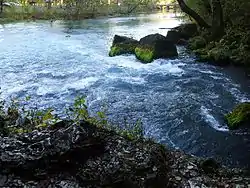 ![]() بیگاسپرینگ در میزوری بزرگترین چشمه در Ozarks Pictured است در ۲۴۰ فوت مکعب بر ثانیه (۶٫۸ متر مکعب بر ثانیه) experiencing low flow after an extended dry period. | |