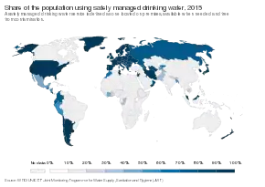 در سال ۲۰۱۰، حدود ۵۶٪ از جمعیت جهان (۵٫۹ میلیارد نفر) به آب لولهکشی خانگی یا یک منبع آب بهبود یافته غیر از خانگی، از جمله تانکر یا انبار آب شهری (به شکل یک لوله ایستاده در داخل خیابان)، کیوسکهای آب، چشمه و چاههای محافظت شده دسترسی داشتند. با این وجود، حدود ۱۳٪ (حدود ۹۰۰ میلیون نفر) به منبع آب بهبودیافته دسترسی نداشتند و مجبور شدند از چاهها یا چشمهها، کانالها، دریاچهها یا رودخانههای محافظت نشده برای آب مورد نیاز خود استفاده کنند.[3]