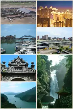 ![]() From left to right, top to bottom: China Airlines passenger plane on the Taoyuan International Airport, Taoyuan district , Yongan Fishing Port, HSR Taoyuan Station, Daxi Old Street of Baroque architecture, Shihmen Reservoir, Small Wulai Waterfall | |