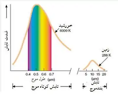بر پایهٔ فرمولهای تابش پلانک، انرژی گسیلشده از جسمی با دمایی برابر با دمای زمین نیز باید در محدوده فروسرخ باشد و طول موجهای این تابش نیز تقریباً در محدودهٔ ۱۰ میکرومتر متمرکز است.