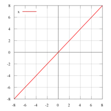 تابع همانی (با دامنهٔ اعداد حقیقی) یک تابع خطّی با شیب ۱ و عرض از مبدأ صفر است.[4]