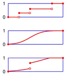 - به عنوان یک نتیجه از تعریف توابع càdlàg ، تمام توابع توزیع تجمعی càdlàg هستند. برای نمونه احتمال تجمعی در نقطه ی r میزان احتمالی است که یک متغیر تصادفی کمتر یا بیشتر از r باشد ، .