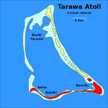 ![]() Map of South Tarawa (red) and North Tarawa (yellow) within Tarawa Atoll | |