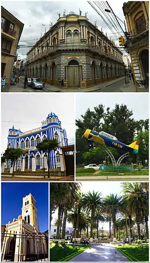 ![]() Clockwise, from top: The Casa de la Cultura; a fighter airplane on display from the Chaco War; the Plaza Luis de Fuentes y Vargas; the church of San Francisco; and the Castillo Azul "Moisés Navajas". | |