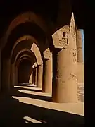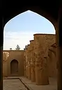 در سمت مغرب مسجد بین ۶ دهانه و طاق، یک دهانه و طاق بزرگتری به طول ۱۲/۱۴ متر و عرض ۰۳/۵ متر وجود دارد، که آثار محراب و منبر مسجد در این دهانه دیده میشود. عرض هر یک از شش دهانه یا ایوان که در طرفین دهانه وسطی واقع شدهاند ۳۶/۶ متر است. صحن مسجد تقریباً مربع شکل و به طول ۲۷ و عرض ۲۶ متر میباشد.[4]