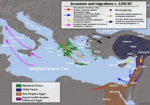 در حدود سال ۱۱۸۰ قبل از میلاد، تجزیه امپراتوری هیتی به جریان افتاد. فروپاشی هیتیها بخشی بزرگ از مقیاس فروپاشی عصر برنز بود که در خاور نزدیک باستان که در حدود ۱۲۰۰ سال قبل از میلاد اتفاق افتاد[52][53]. در یونان رژیمهای میسنی و مینوسی هر دو از هم پاشیدند[54]. موجی از مردمان دریا (مردم مهاجر اطراف مدیترانه) به بسیاری از کشورها حمله کردند که در طی این حملات فقط مصر سالم باقی ماند. پس از آن تمدنهای کاملاً جدیدی در مدیترانه شرقی بوجود آمد.[55]
