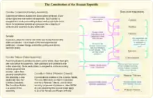 - دوران جمهوری روم، که از ۵۰۹ پ. م شروع میشود زمانیکه پادشاه توسط سناتورها انتخاب میشدند. در این دوره در طول قرن پنجم قبل از میلاد روم بصورتی فوقالعاده وسعت پیدا کرد و روم مناطقی را در لاتیوم به تصرف درآورد. در دوران جنگهای پونیک در ۲۶۴ تا ۱۴۶ پ. م، روم باستان به مناطق غرب مدیترانه مسلط میشود و جانشین تمدن کارتاژ میشود.