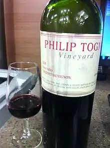 یک بطری شراب قرمز، تهیهشده از انگور کابرنه ساوینیون، از تاکستانهای درهٔ نَپا.