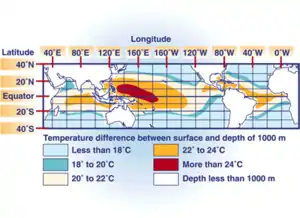 تبدیل انرژی گرمایی اقیانوس (OTEC) از اختلاف دما بین عمق سردتر و سطح یا عمق کمتر گرمتر آب اقیانوس برای به حرکت درآوردن موتور گرمایی و انجام کار مفید (معمولاً به صورت برق) استفاده میشود.