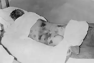 | یک بیمار مبتلا به تب خونریزیدهنده کریمه-کنگو در قرنطینه که دچار خونریزیهای پوستی است (۱۹۶۹)[1] | |