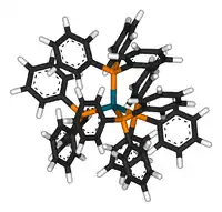 | four تریفنیلفسفین unidentate لیگاند attached to a central پالادیم(0) atom in a چهاروجهی geometry | |